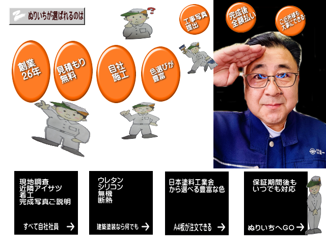 安心満足お約束施工 全額!完成後にお支払い施工! 当社の工事は 着工金 途中経過金 一切ございません 工事が全て完成してから、全額のご集金になります 安心 丁寧 施工実績 外壁塗装工事 神奈川県 藤沢市 外壁屋根塗装工事 神奈川県 高座郡寒川町 外壁屋根塗装工事 神奈川県 藤沢市 外壁屋根塗装工事 神奈川県 高座郡寒川町 当社ぬりいちは、寒川町のもくせい号を応援してます お値段 お値段例 ぬりいちの得意技 得意技 ぬりいちが選ばれるのは!? LINEでご相談、お見積もり 施工ブログ ぬりいちは、寒川町広報を応援しております アクセス 住所 神奈川県高座郡寒川町倉見1383-9 倉見駅東口 徒歩9分 TEL0467-72-6130 FAX0467-72-5682 Email yushiyunori@gmail.com